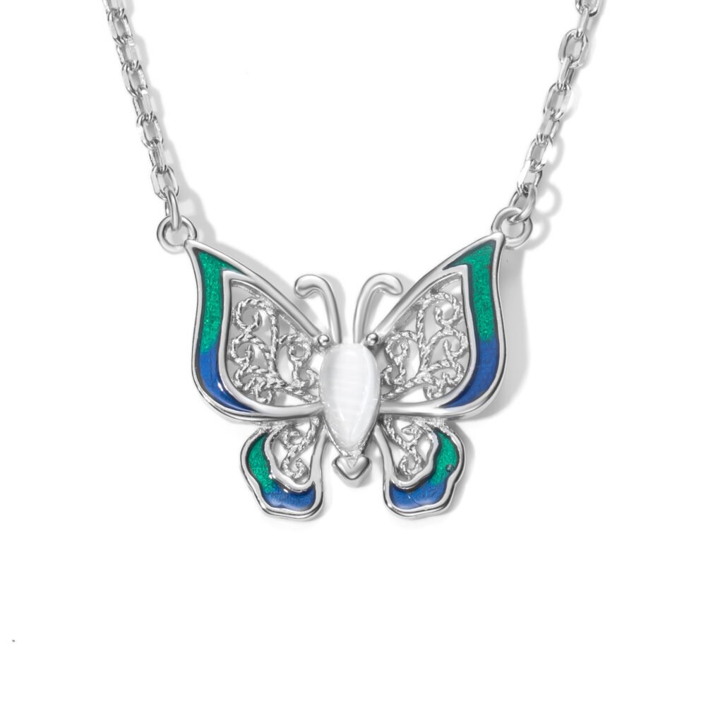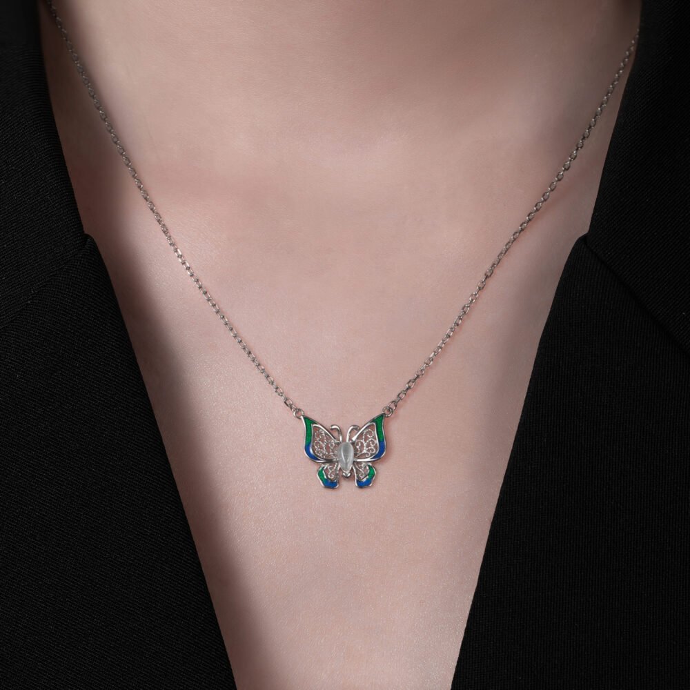 Inspiration :Ce collier en argent 925 incarne élégance et vivacité grâce à son pendentif papillon émaillé multicolore. Les tons bleus