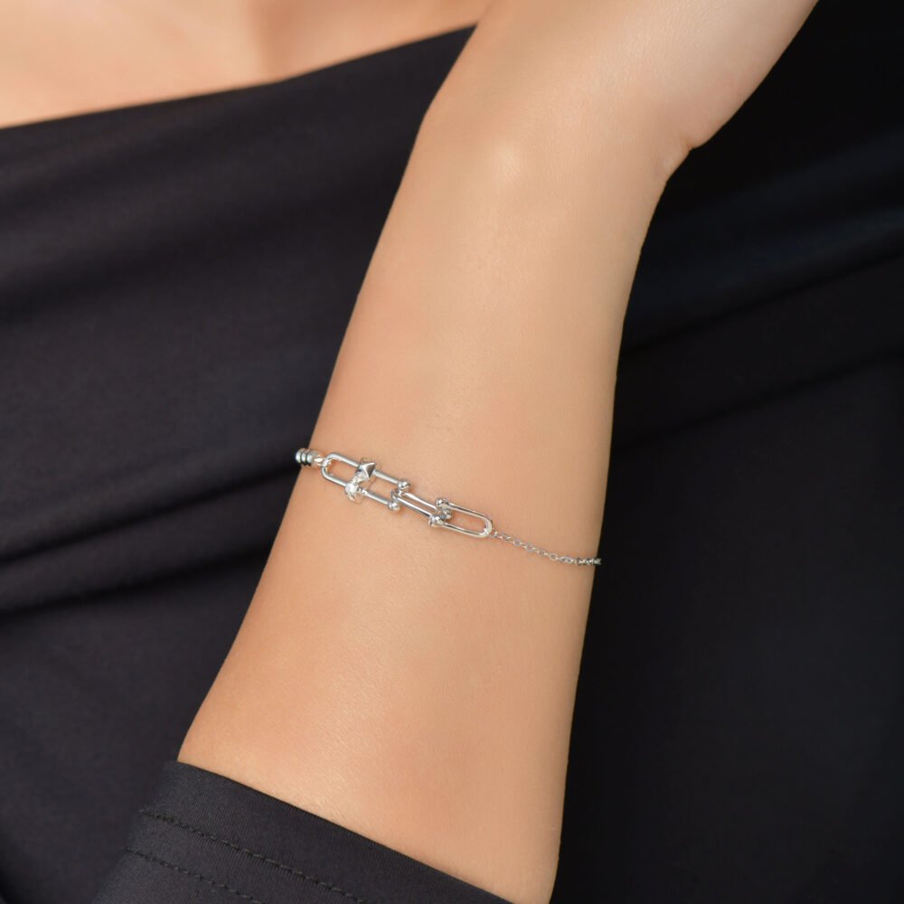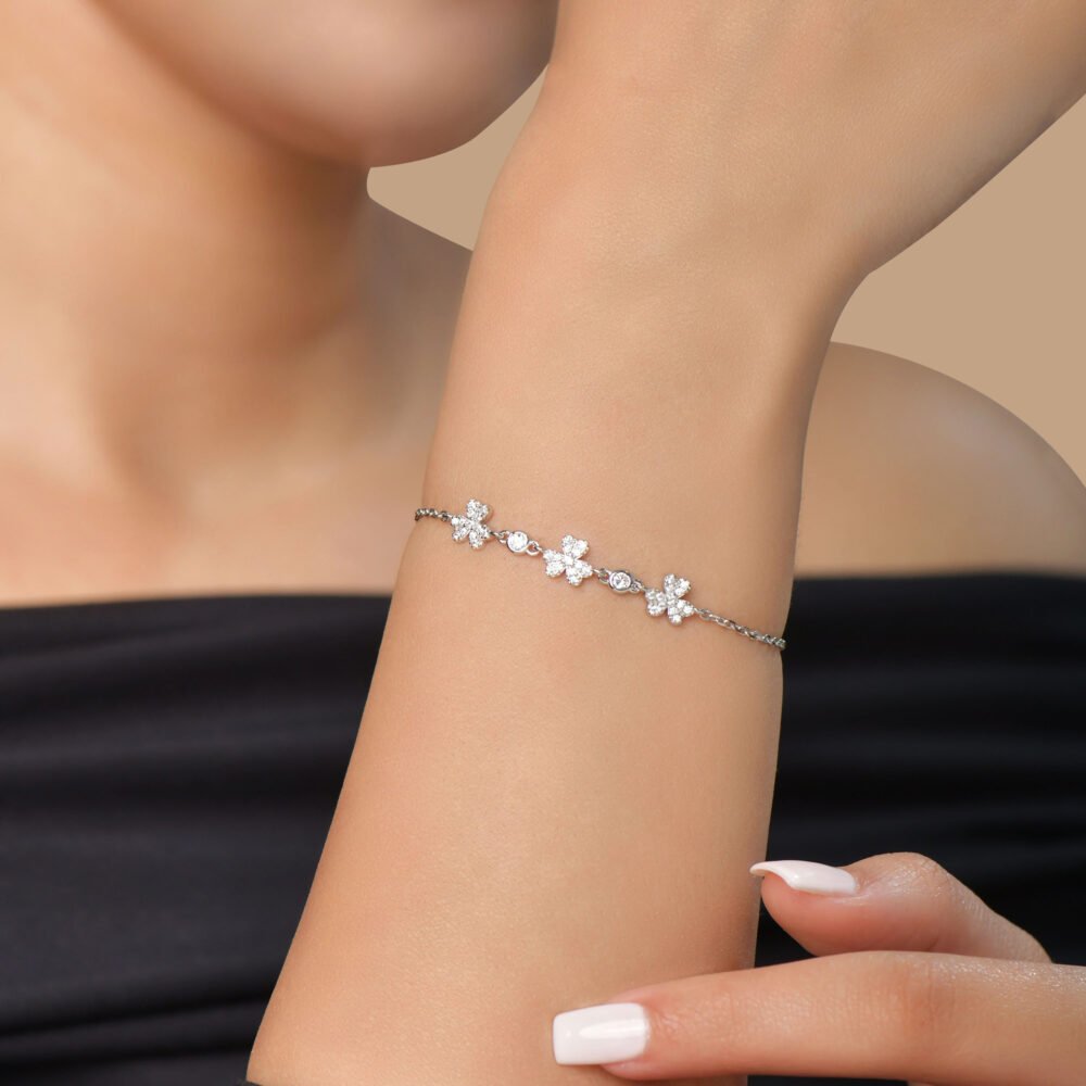 Un bracelet fin en argent 925 avec trois pendentifs Khmissa délicatement sertis de pierres scintillantes, offrant une élégance moderne et raffinée.