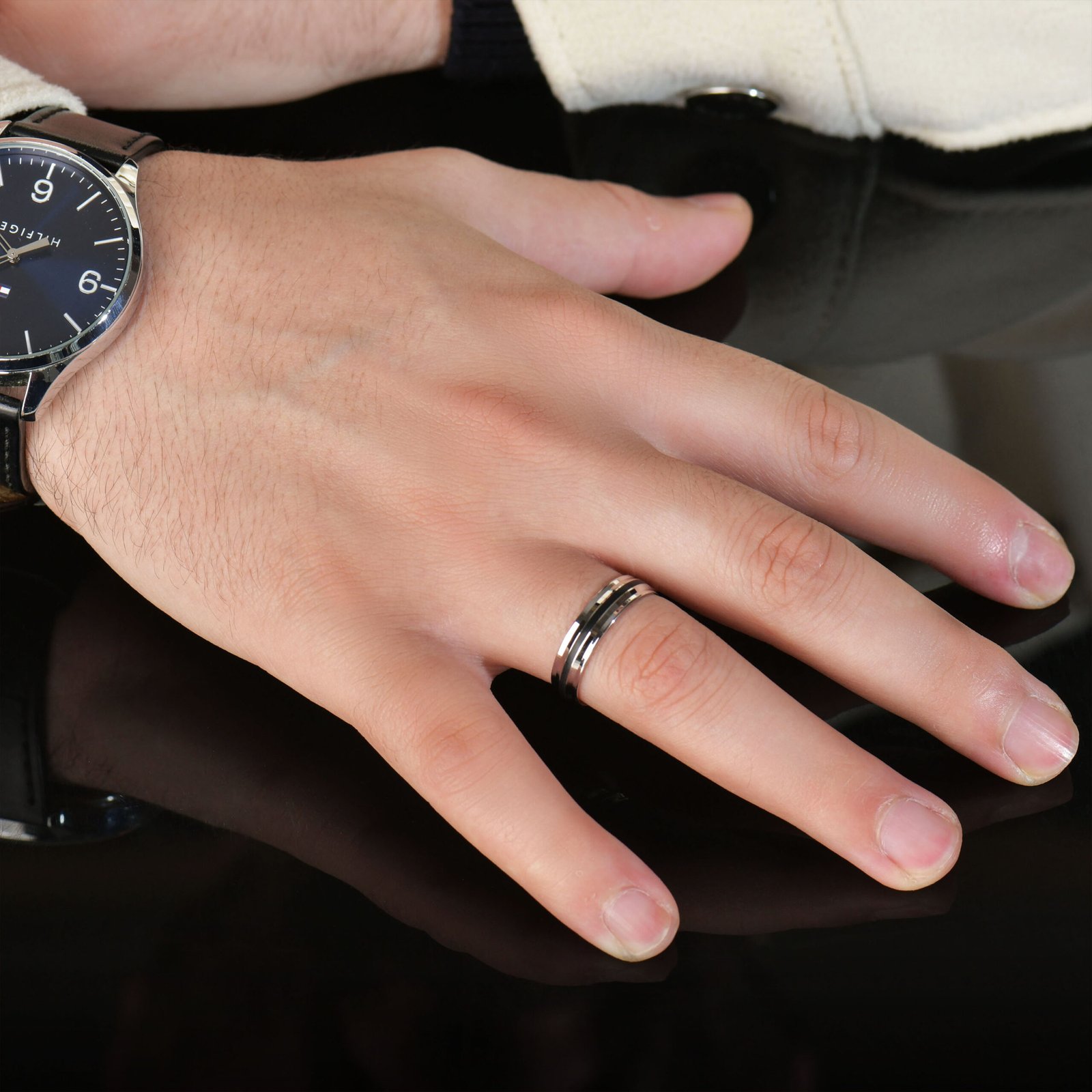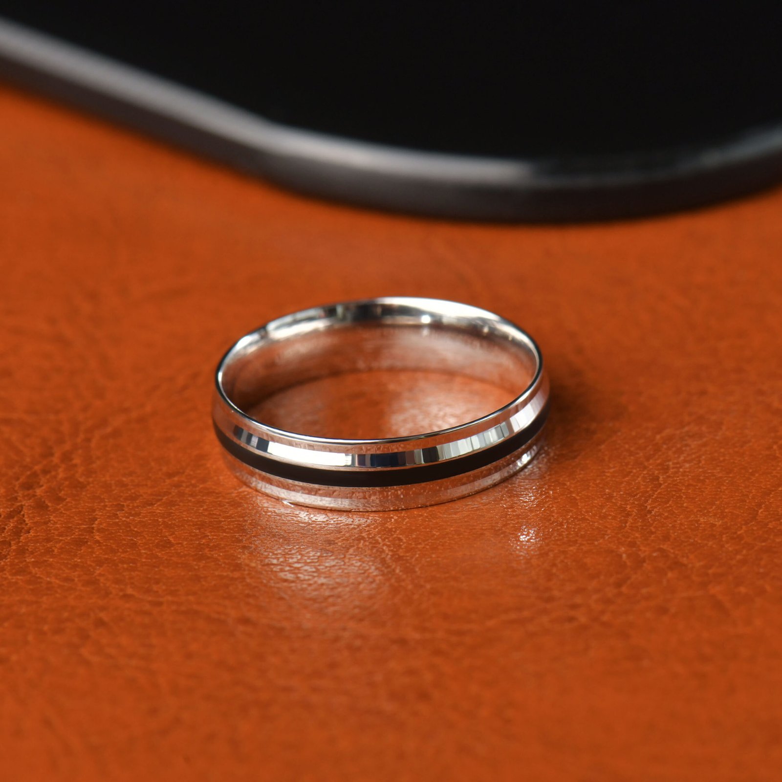 Une fine rainure noire en émail court sur tout le pourtour de l’anneau, divisant délicatement la surface en deux bandes d’argent poli brillant. Ce détail subtil transforme un simple anneau en une pièce de caractère, sans ostentation ni excès. Le résultat est un bijou unisexe, porté aussi bien par les hommes que par les femmes.