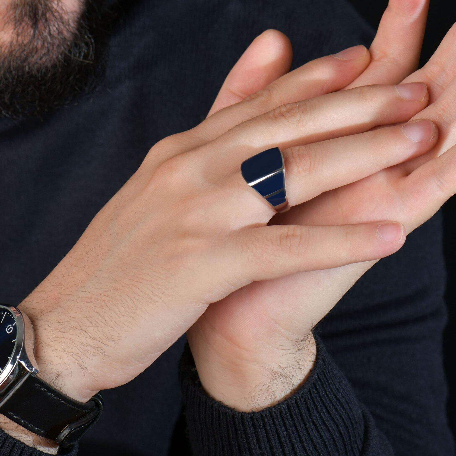 La face carrée en émail bleu royal rappelle les grandes maisons joaillières et les traditions héraldiques européennes. Ce bleu profond et vibrant, soutenu par des bandes latérales en émail bleu nuit, crée une profondeur chromatique que peu de bijoux masculins parviennent à égaler. La monture en argent 925 rhodié vient sublimer l’ensemble avec ses reflets blancs lumineux.