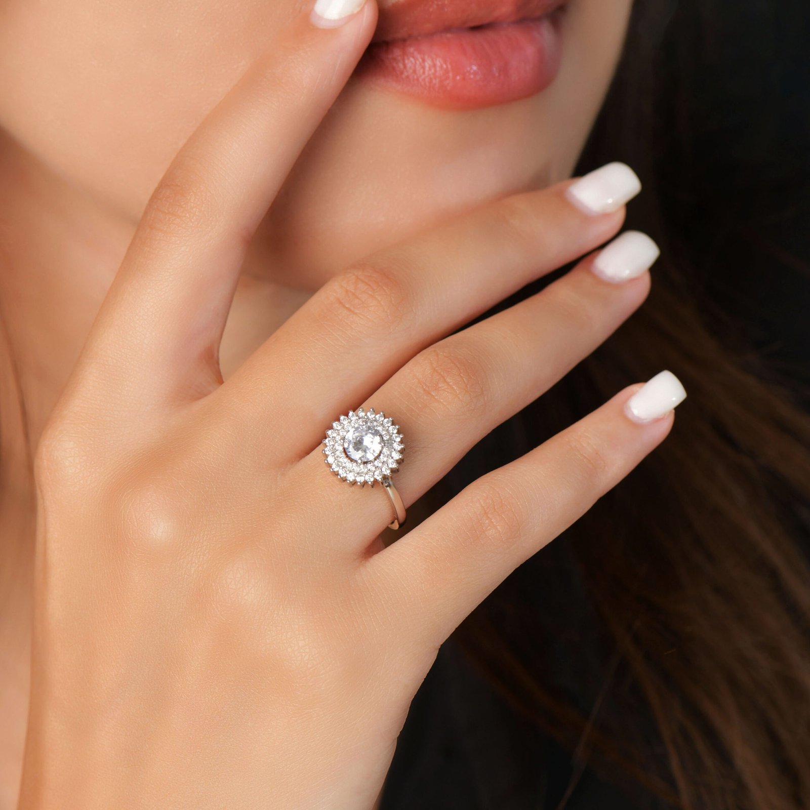 Confectionnée en argent massif 925 rhodié, cette bague se distingue par son pierre centrale ronde taillée avec précision, reflétant une brillance exceptionnelle. Celle-ci est entourée d’un double halo de zircons cubiques finement sertis, créant un jeu de lumière étincelant à chaque mouvement.