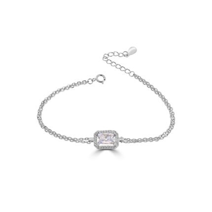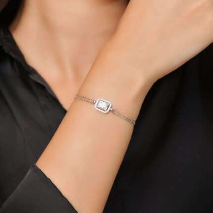 Bracelet en argent massif 925, composé d’une chaîne fine maille forçat, orné au centre d’un motif infini pavé de petites zircones blanches scintillantes. Le symbole est finement ciselé pour capter la lumière et offrir un éclat subtil. Fermoir mousqueton sécurisé avec chaînette d’extension pour un ajustement facile et confortable.