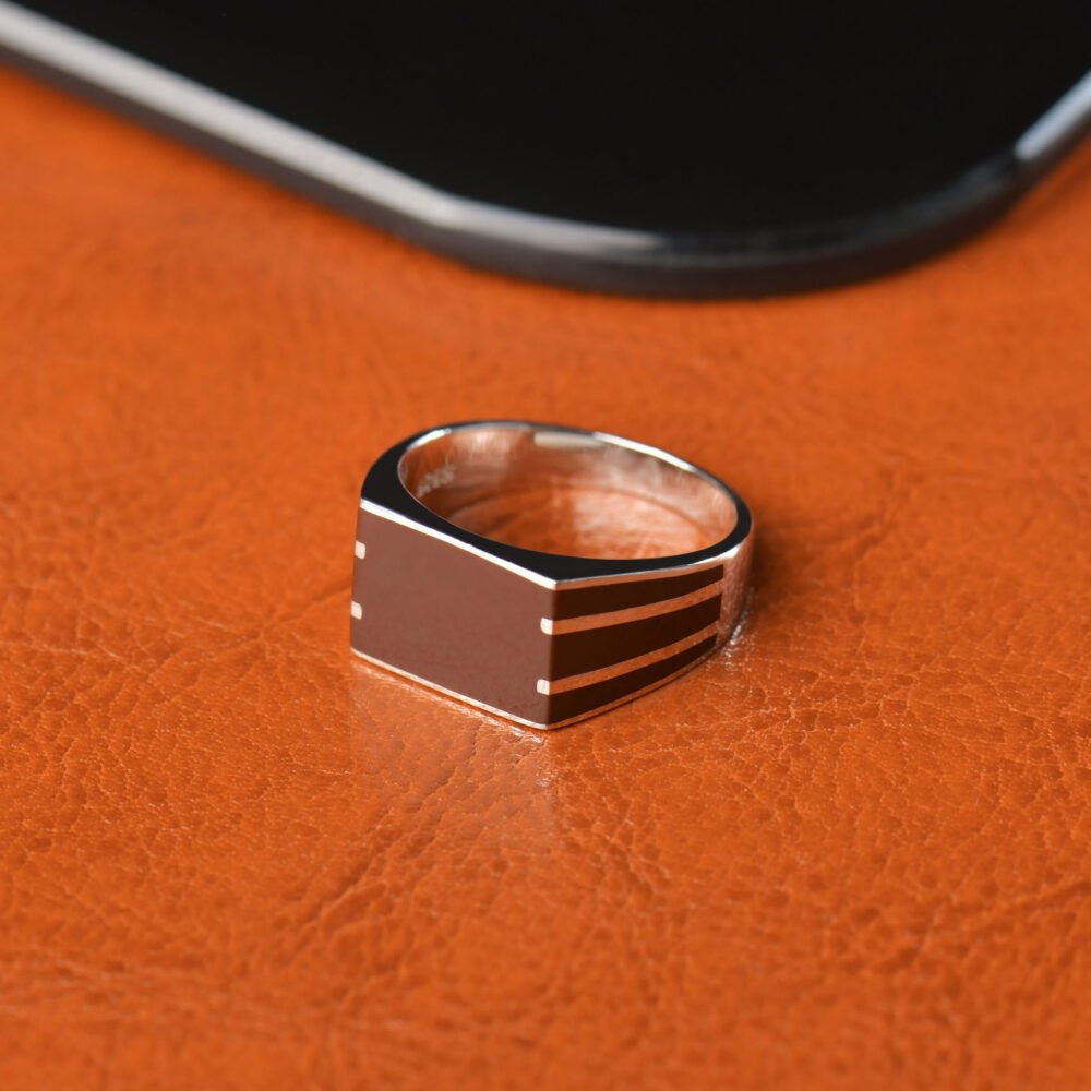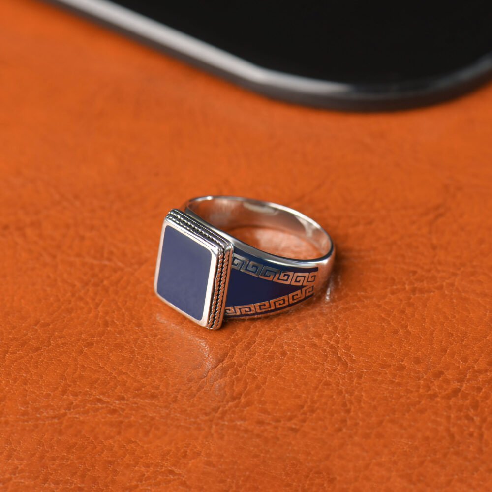 Affichez votre affection pour les traditions orientales majestueuses. Une chevalière rectangulaire en argent massif finement ciselée, arborant un motif saoudien classique sur fond d’émail bleu roi éclatant.