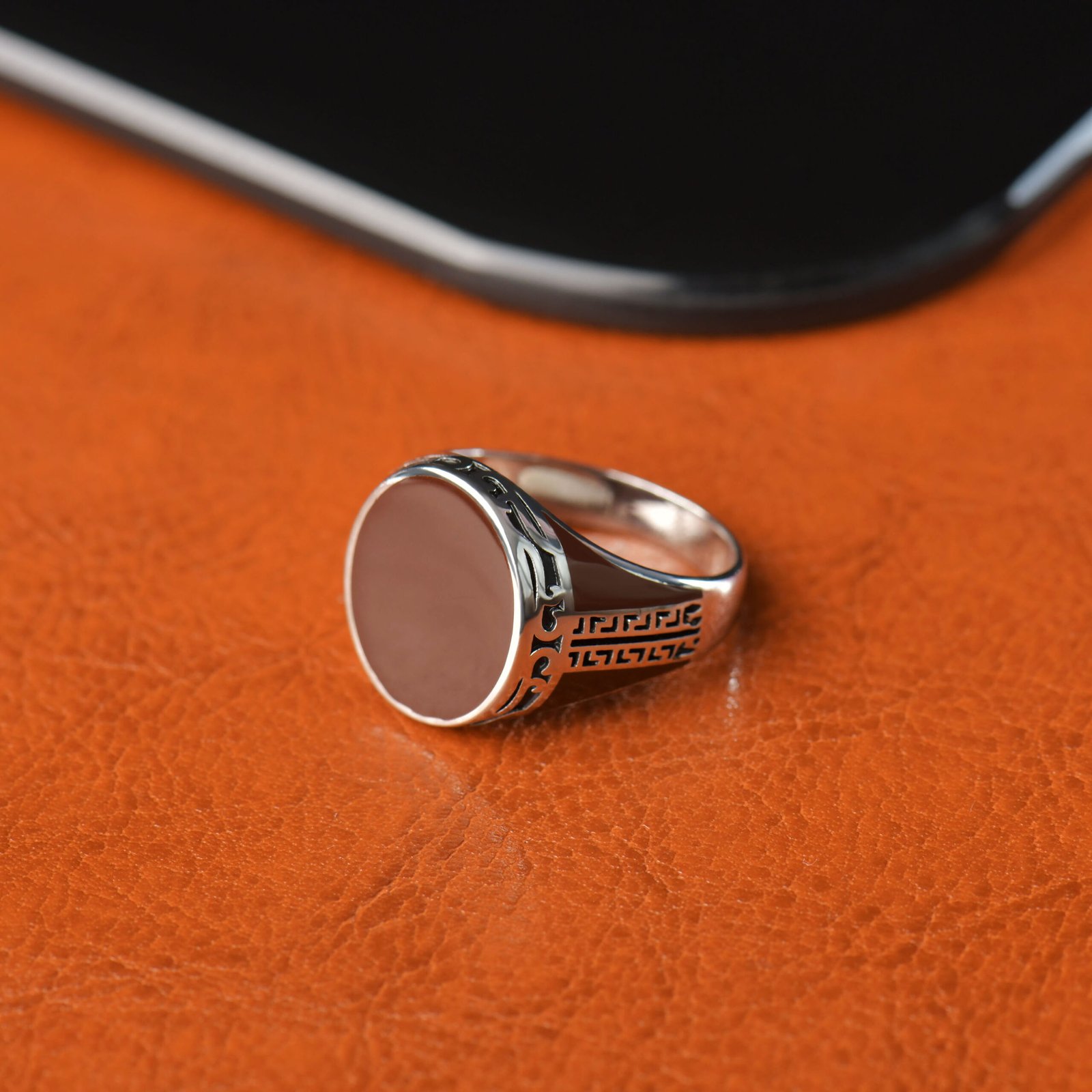 Sur une exceptionnelle structure en argent massif 925 millièmes (le plus haut grade de joaillerie usuel, la fameuse no9ra), le maître artisan a forgé un large et rassurant cercle plat en guise de plateau central. La couleur choisie est un vibrant ocre/marron tirant sur l’ambre, qui rappelle doucement la prestigieuse pierre de cornaline.
