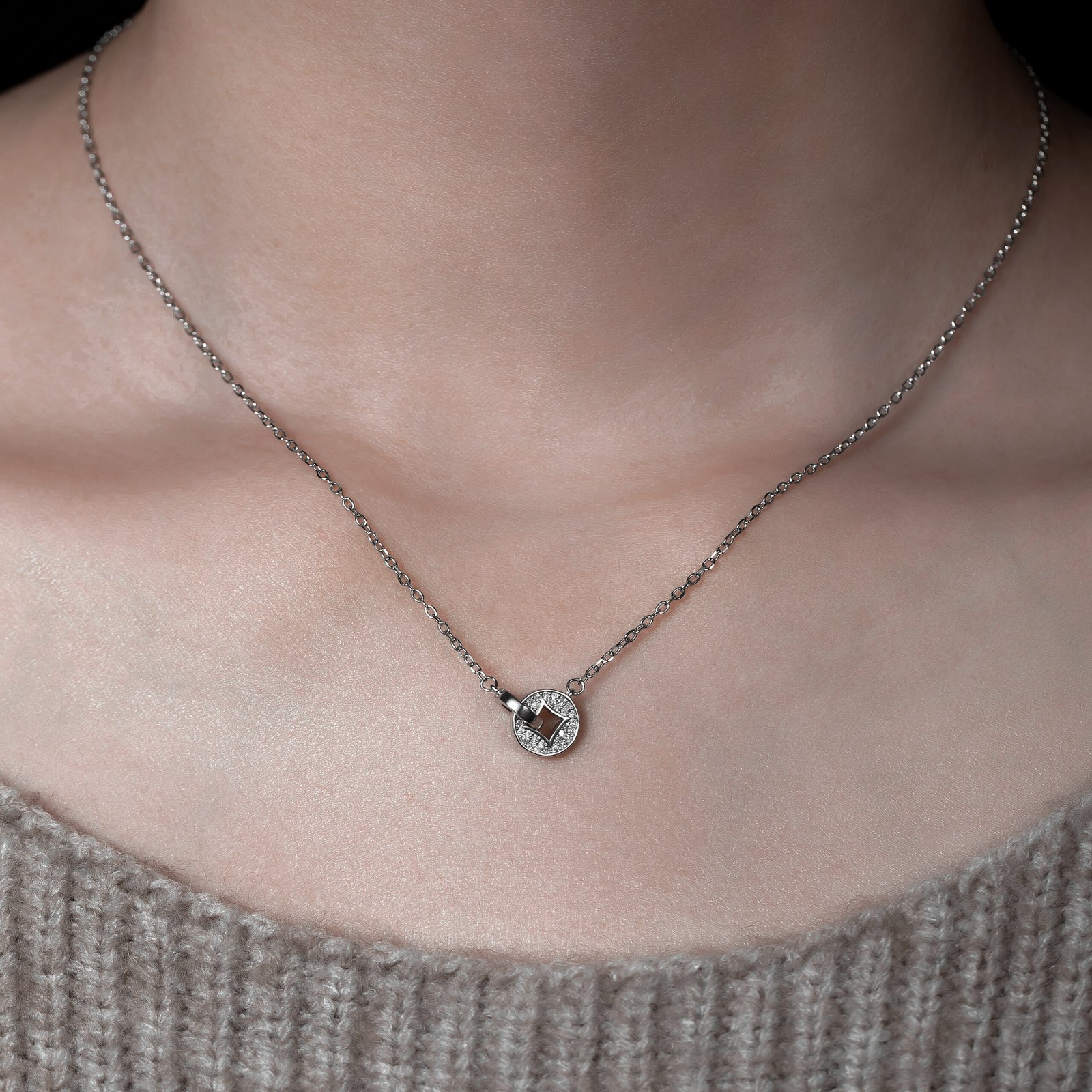 Ce collier fin en argent 925 présente un pendentif rond orné d’un motif carré stylisé en son centre. Le contour du cercle est pavé de zircones cubiques blanches, capturant la lumière à chaque mouvement. La chaîne délicate met en valeur l’éclat du pendentif tout en assurant un port confortable et raffiné.