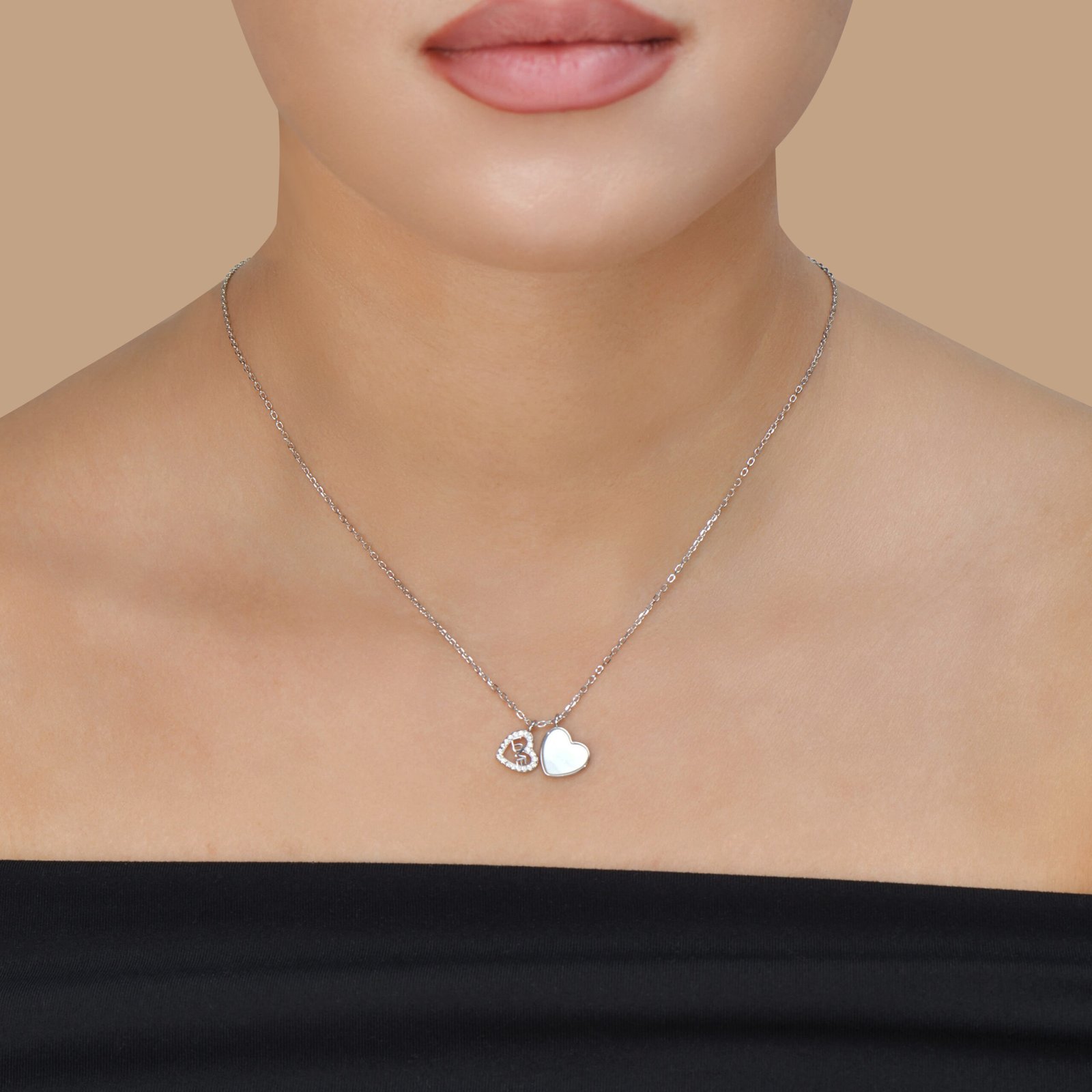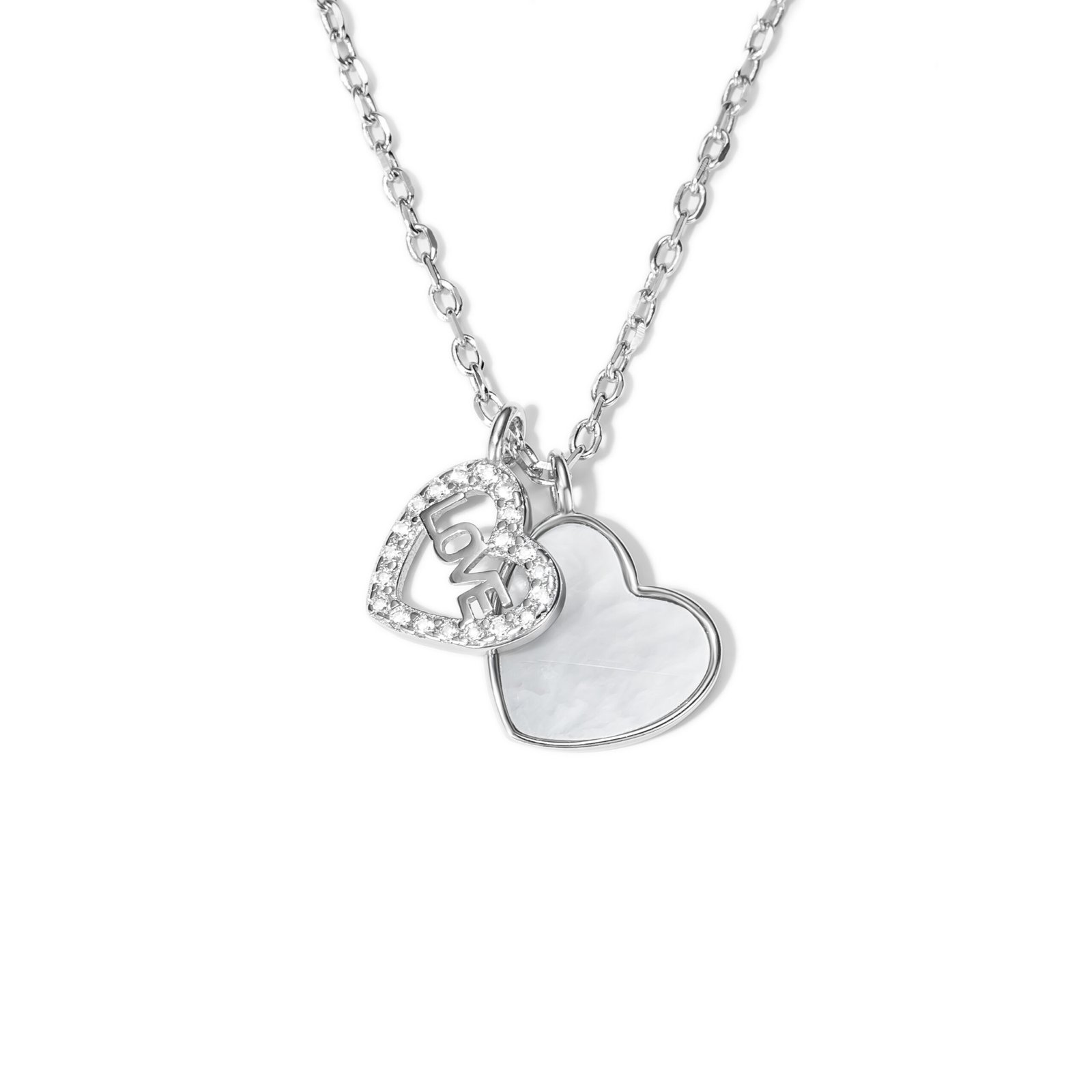 Collier en argent massif 925, composé d’une chaîne fine et délicate, mettant en valeur deux pendentifs en forme de cœur subtilement superposés. L’un des cœurs est lisse et poli pour un effet miroir raffiné, tandis que l’autre est serti de petites zircones cubiques blanches pour une brillance délicate. Ensemble, ils créent un jeu de lumière et de mouvement captivant.