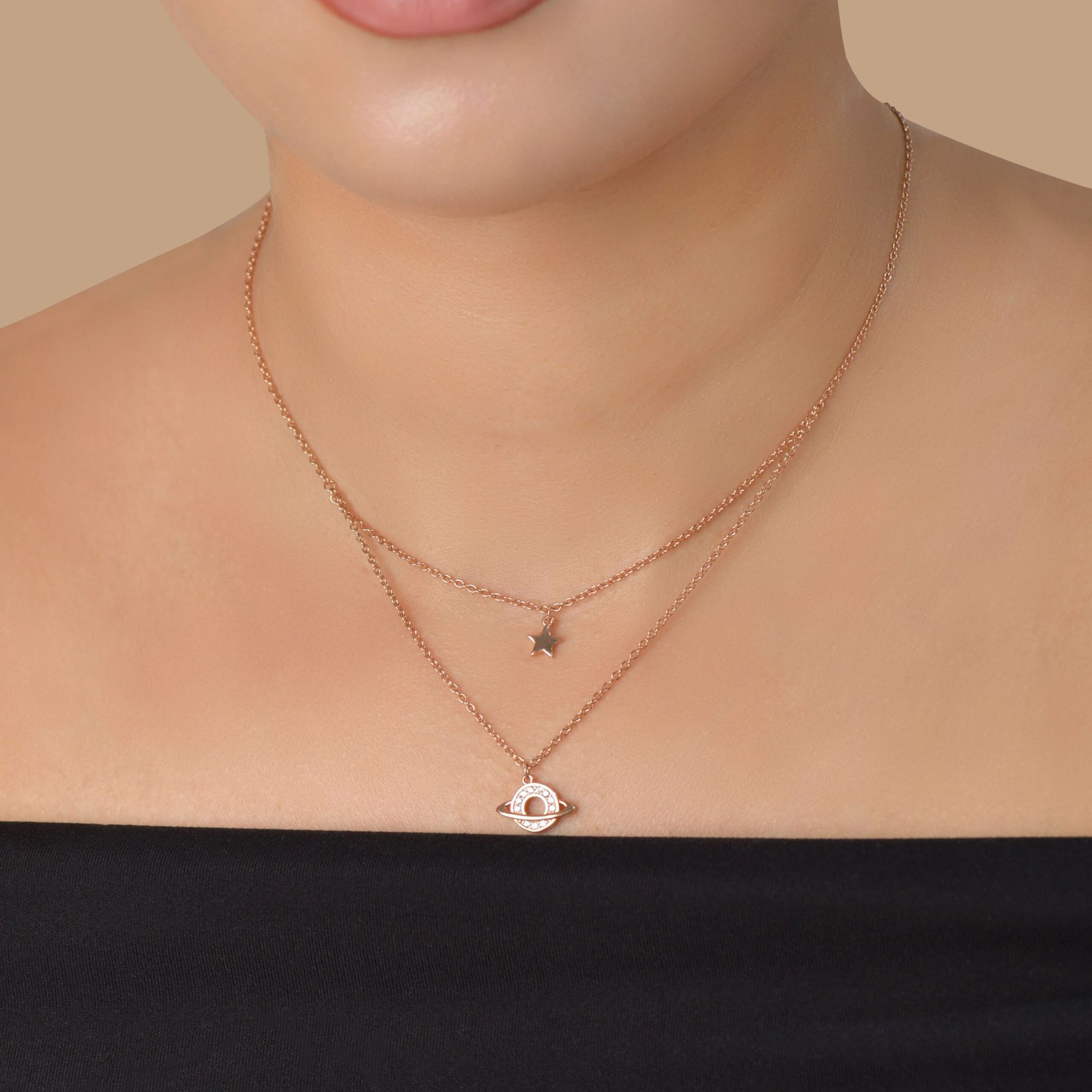 Collier double chaîne en argent 925 plaqué or rose avec pendentifs étoile et planète. Un bijou féminin, moderne et lumineux qui sublime toutes vos tenues avec élégance.