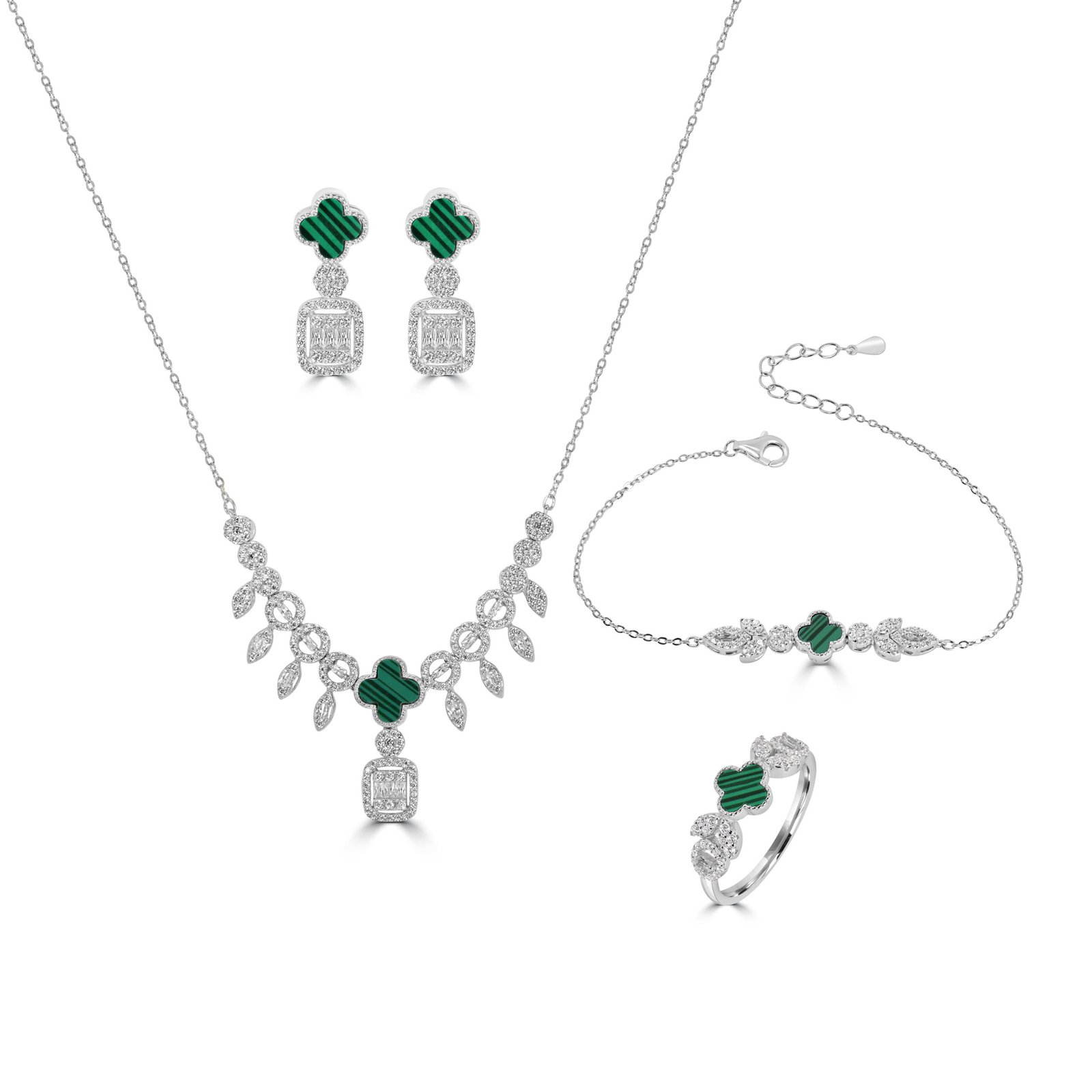 Chaque pièce met en valeur un motif trèfle en malachite naturelle, symbole de chance et d’élégance, sublimé par des zircons cubiques finement sertis.