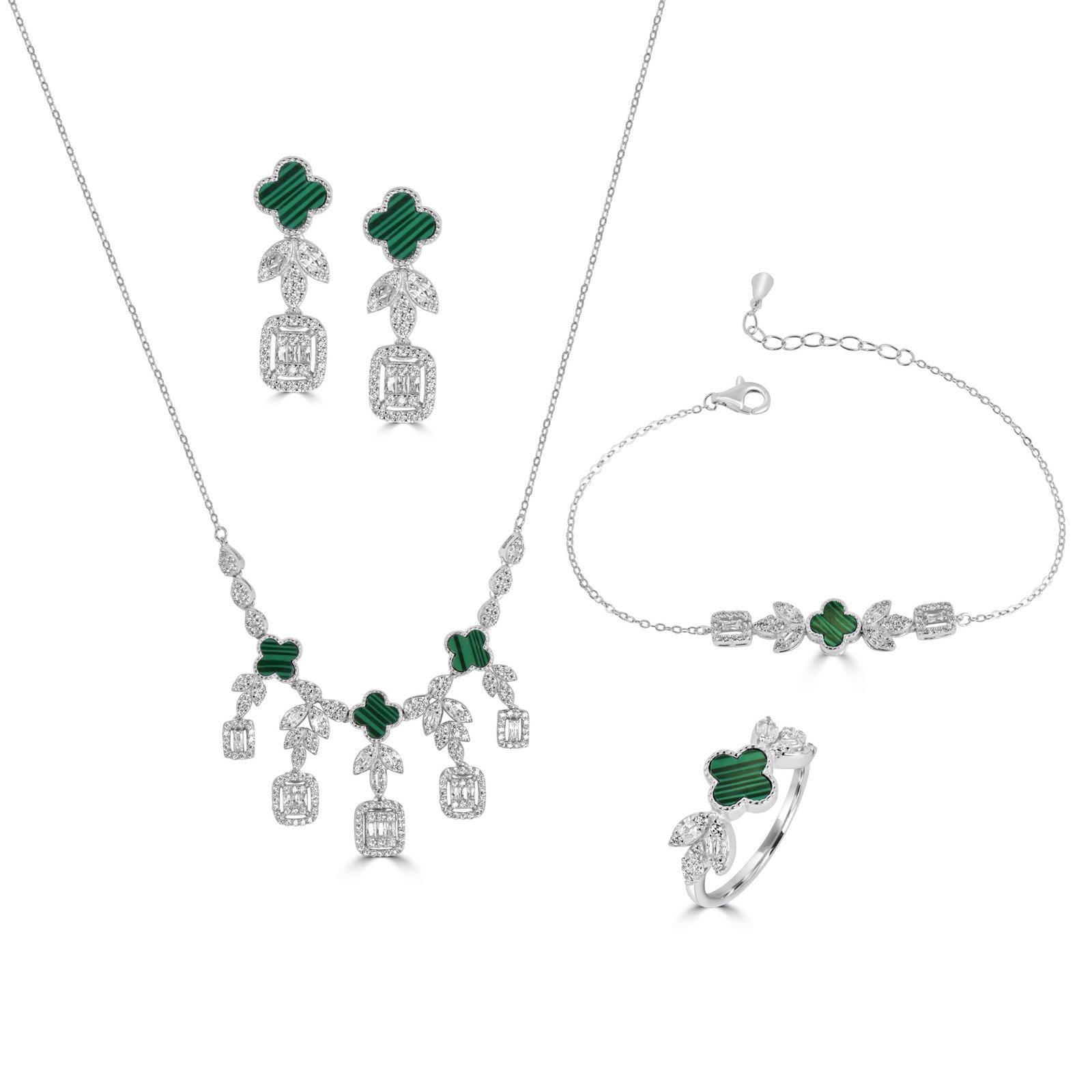 Le design met en avant le motif trèfle en malachite verte, symbole de chance et de sérénité, accompagné de feuilles serties de zircons cubiques étincelants.