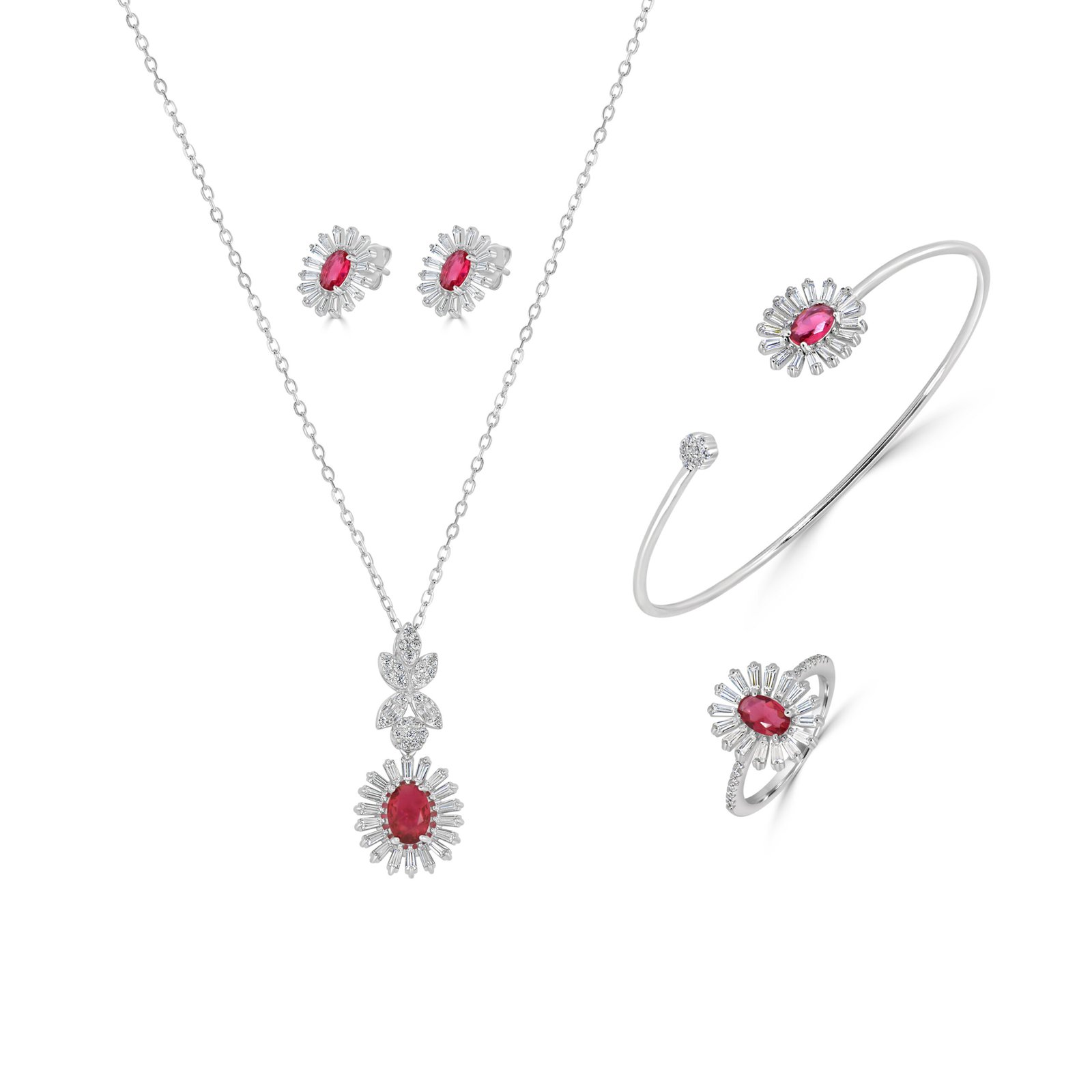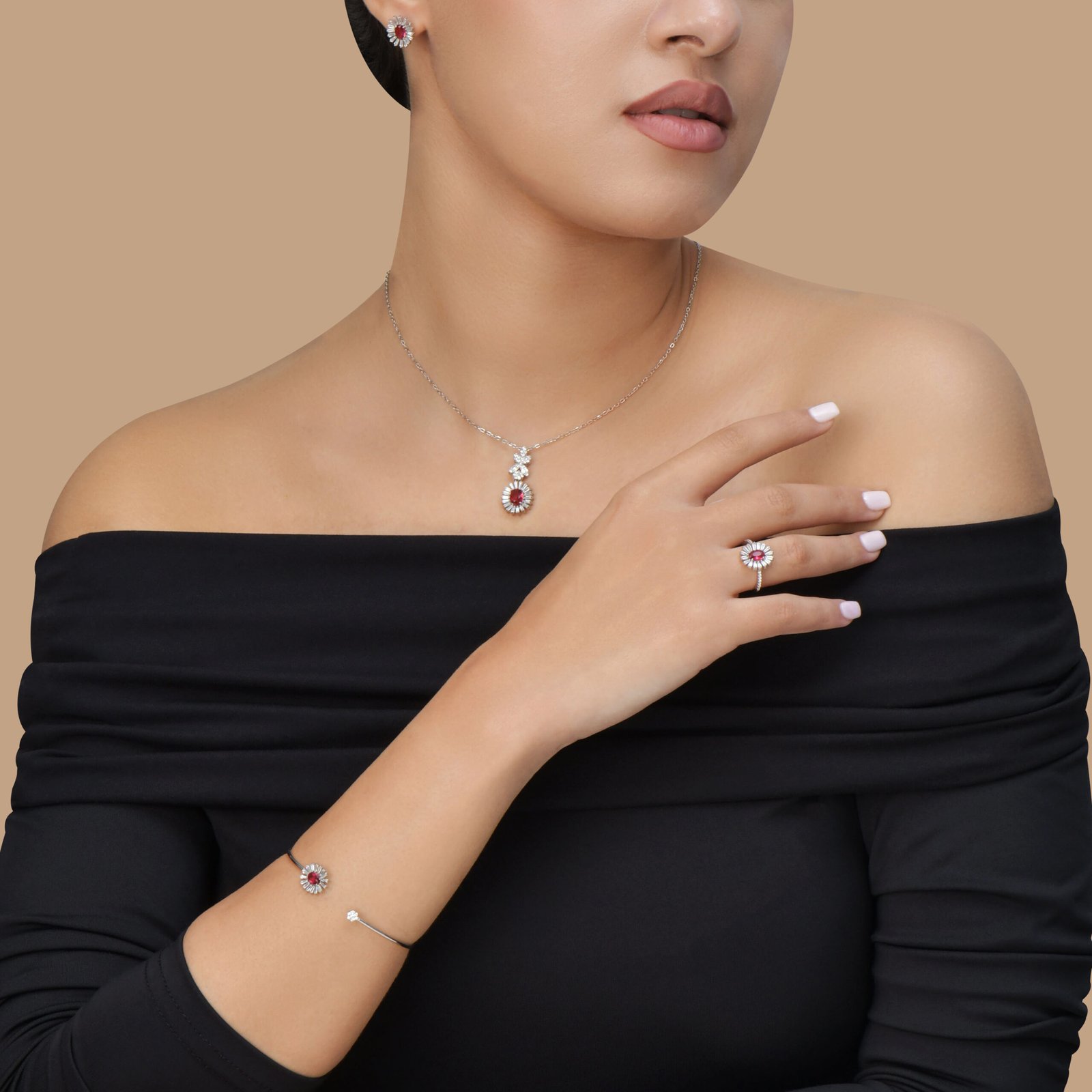 La Parure Rubis Éclat Royal en argent 925 sublime votre élégance avec ses pierres rouges éclatantes entourées de zirconiums lumineux. Un ensemble raffiné et intemporel, idéal pour sublimer vos plus belles occasions.